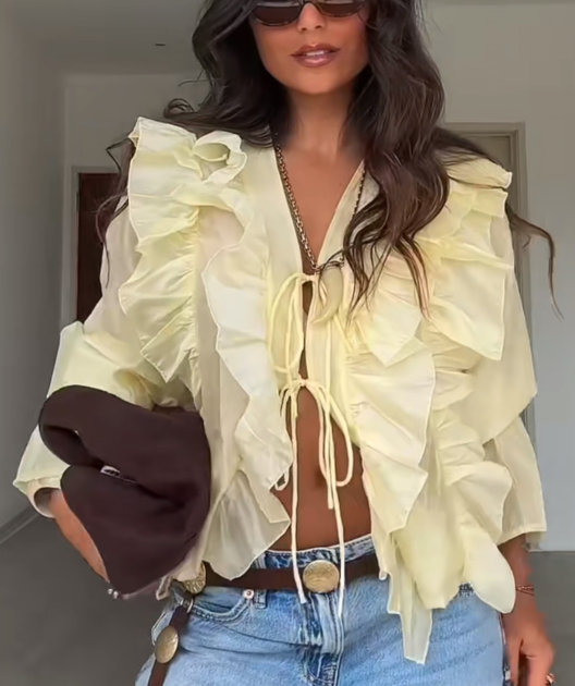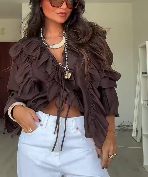 Effortlessly chic and full of movement, this V-neck blouse combines airy looseness with delicate ruffle detailing for a look that’s both romantic and modern. The deep V-neckline elongates the silhouette, while cascading ruffles frame the shoulders and cascade down the placket, adding soft, feminine texture.