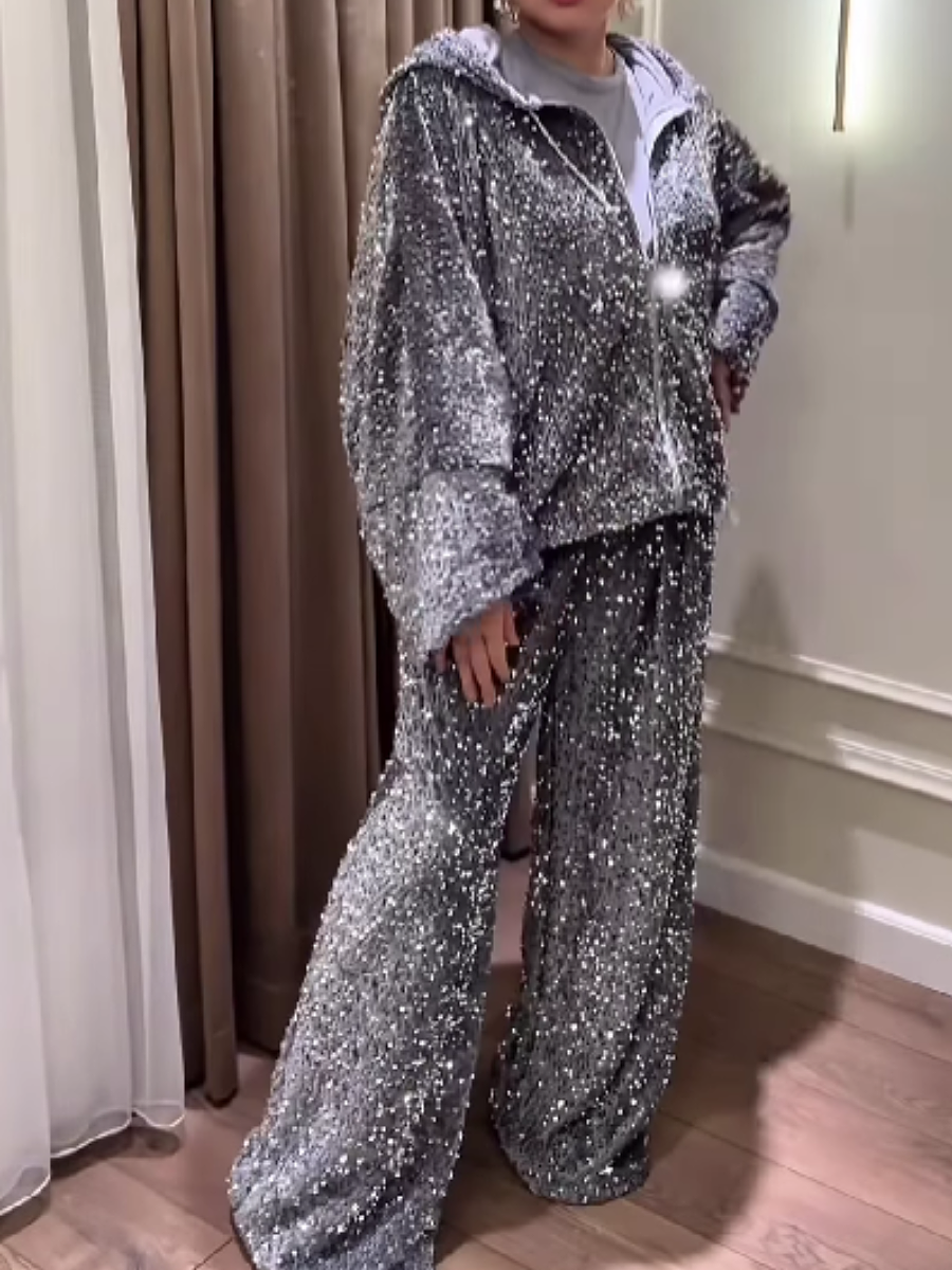 The hoodie features a relaxed, oversized fit, a full-zip front, and a cozy hood (lined for extra softness) for laidback cool. The high-waisted pants boast a flowy, wide-leg silhouette that balances the bold sequin texture with effortless movement—perfect for dancing, events, or making a statement on casual days.